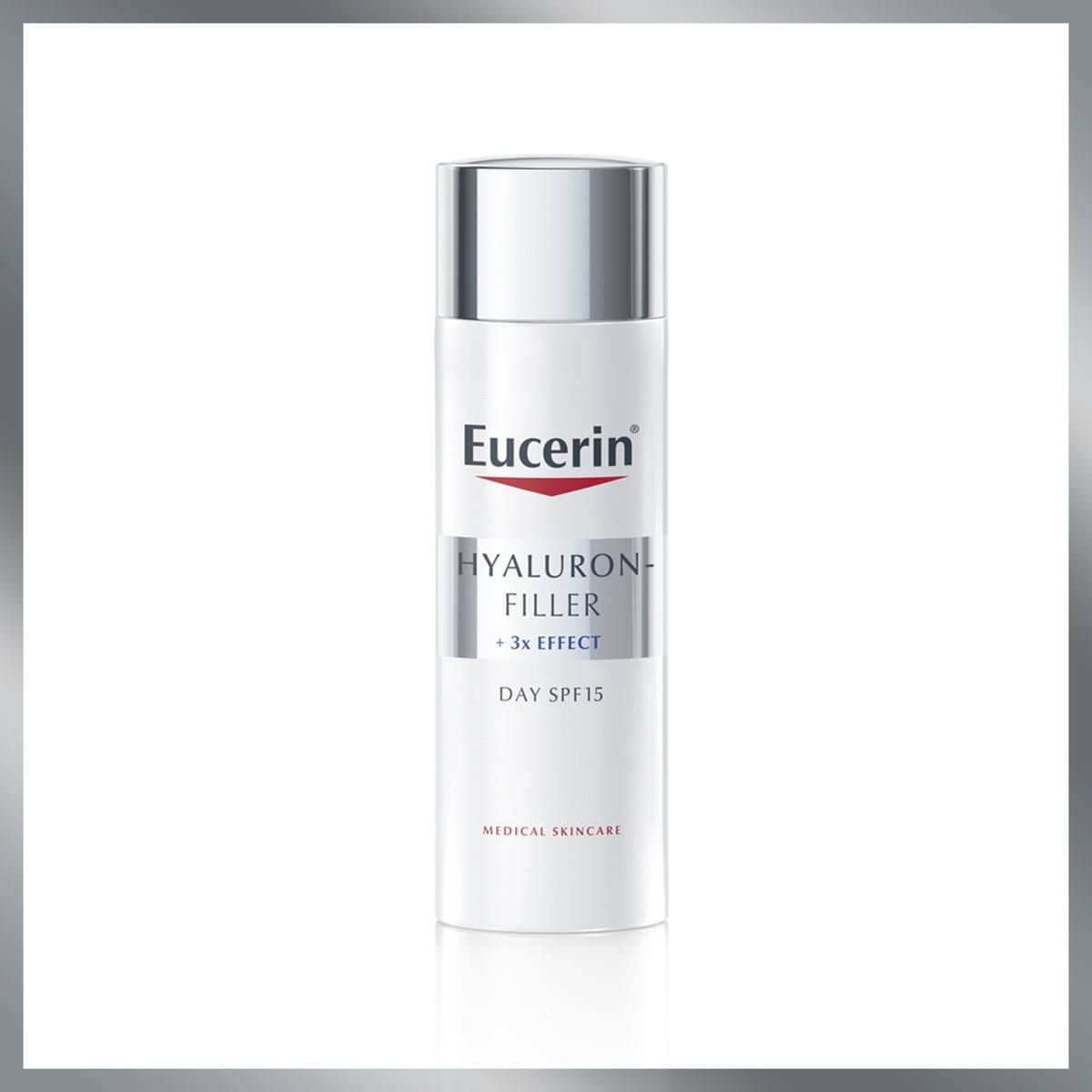 Eucerin Hyaluron-Filler Denný krém SPF 15 bojuje s prvými príznakmi starnutia pleti. Viditeľne vyhladzuje jemné linky aj hlboké vrásky, a stará sa tak o mladistvý vzhľad pleti. Poskytuje pleti účinnú ochranu proti predčasnému starnutiu spôsobenému UV žiarením a proti prehlbovaniu vrások a zároveň ju chráni pred voľnými radikálmi.Inovatívna kombinácia vysoko- a nízkomolekulárnej kyseliny hyalurónovej, glycínu saponínu a enoxolónu prináša cielený prístup na vyhladenie aj hlbokých vrások. Vysokomolekulárna kyselina hyalurónová zlepšuje hydratáciu a vyhladzuje najvrchnejšie vrstvy pleti, zatiaľ čo nízkomolekulárna kyselina hyalurónová, ktorej molekula je 40-krát menšia1, preniká hlbšie do vrstiev epidermis kože, kde vznikajú hlbšie vrásky. Antioxidant glycín saponín podporuje tvorbu vlastnej kyseliny hyalurónovej v dermis vrstve, kde vznikajú tie najhlbšie vrásky, a zároveň chráni pred voľnými radikálmi. Enoxolón chráni pred degradáciou pleti vlastnej kyseliny hyalurónovej.1 V porovnaní s vysokomolekulárnou kyselinou hyalurónovou, ktorá je tiež súčasťou zloženia.