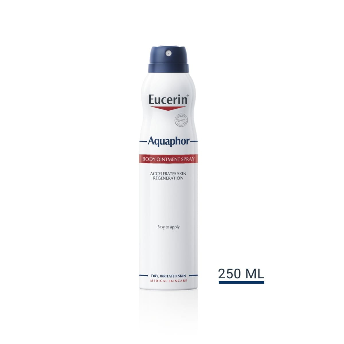 Vďaka inovatívnemu rozprašovaču je Eucerin Aquaphor Telová masť v spreji najvhodnejšia na použitie na väčšie časti tela, ako sú ruky, nohy, chrbát či trup. Umožňuje rozprašovanie aj dnom nahor, je preto vhodná pre upokojenie veľmi suchej pokožky na ťažko prístupných partiách, kde by aplikácia klasickej masti bola príliš ťažká. Vyvarujte sa priamemu striekaniu na tvár či v jej oblasti. Ak máte veľmi suchú alebo drsnú pokožku na menších častiach tela, vyskúšajte Eucerin Aquaphor Regeneračnú masť.