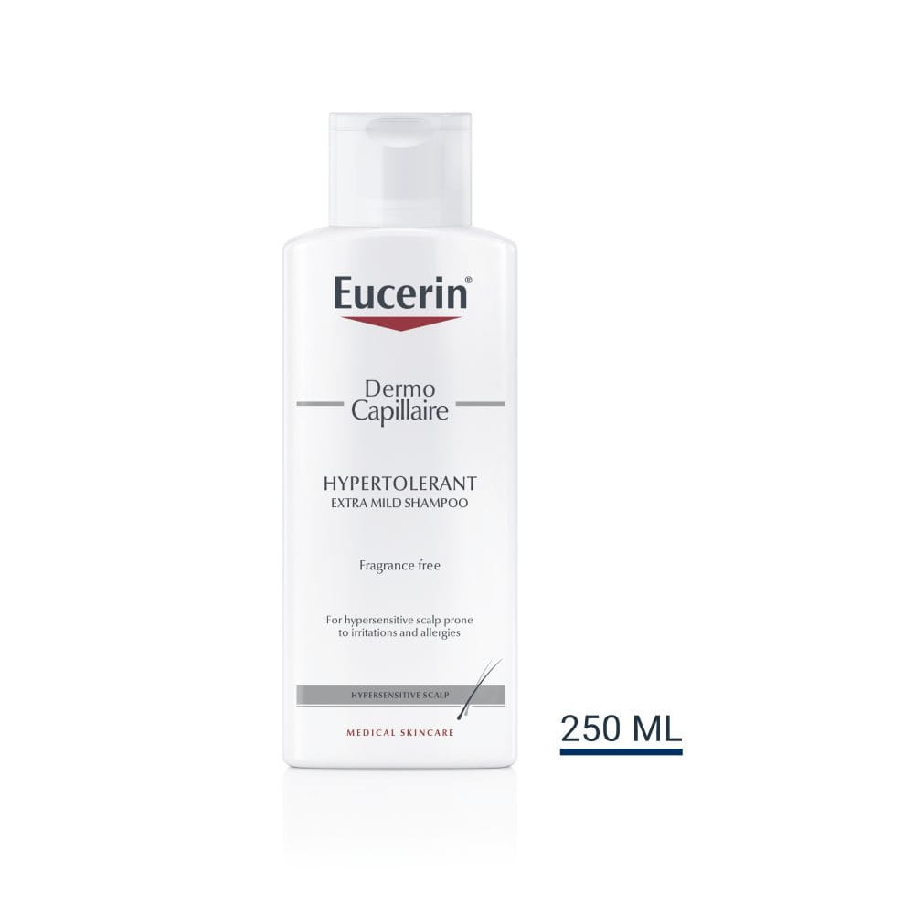 Eucerin DermoCapillaire Hypertolerantný šampón je určený špeciálne pre osoby s veľmi citlivou vlasovou pokožkou. Jeho veľmi jemné zloženie vlasy a vlasovú pokožku šetrne čistí a zároveň chráni vlasovú pokožku pred vysušovaním. Upokojuje pokožku a zmierňuje svrbenie od prvého použitia. Vhodný pre dojčatá a deti.