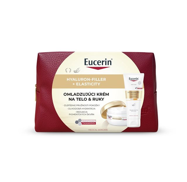 Eucerin Hyaluron-Filler + Elasticity Telový krém s omladzujúcim účinkom obsahuje arctiín, ktorý stimuluje produkciu kolagénu, ktorý zlepšuje pružnosť a pevnosť pokožky. Zloženie s patentovaným tiamidolom viditeľne redukuje výskyt tmavých škvŕn, a zanecháva tak zjednotenú a žiarivú pokožku. Kyselina hyalurónová navyše pokožku intenzívne hydratuje a zjemňuje. Krém má hodvábnu a nemastnú textúru.
