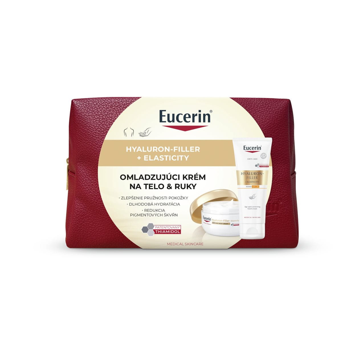 Eucerin Hyaluron-Filler + Elasticity Krém na ruky s depigmentačným účinkom je rýchlo sa vstrebávajúci krém na ruky na korekciu pigmentových/stareckých škvŕn. Obsahuje patentovaný tiamidol, ktorý redukuje tmavé škvrny a pri pravidelnom používaní bráni ich opakovanému výskytu. Tento krém na ruky sa rýchlo vstrebáva, zlepšuje pružnosť pokožky a poskytuje hydratáciu na 24 hodín. SPF 30 zaisťuje dodatočnú ochranu pred budúcimi pigmentovými škvrnami spôsobené slnečným žiarením.