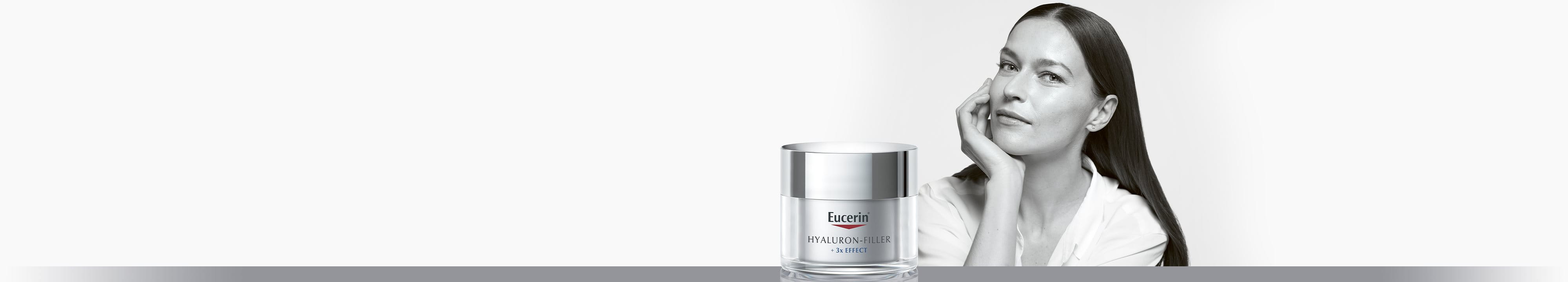 Rad Eucerin Hyaluron-Filler + 3x EFFECT bol vyvinutý špeciálne na to, aby bojoval proti prvým príznakom starnutia, ako sú jemné linky a vrásky. Inovatívna kombinácia vysoko- a nízkomolekulárnej kyseliny hyalurónovej, glycínu saponínu a enoxolónu prináša cielený prístup na vyhladenie aj hlbokých vrások. Vysokomolekulárna kyselina hyalurónová zlepšuje hydratáciu a vyhladzuje najvrchnejšie vrstvy pleti, zatiaľ čo nízkomolekulárna kyselina hyalurónová, ktorej molekula je 40-krát menšia1, preniká hlbšie do vrstiev epidermis kože, kde vznikajú hlbšie vrásky. Antioxidant glycín saponín podporuje tvorbu vlastnej kyseliny hyalurónovej v dermis vrstve, kde vznikajú tie najhlbšie vrásky, a zároveň chránia pred voľnými radikálmi. Enoxolón chráni pred degradáciou pleti vlastnej kyseliny hyalurónovej.