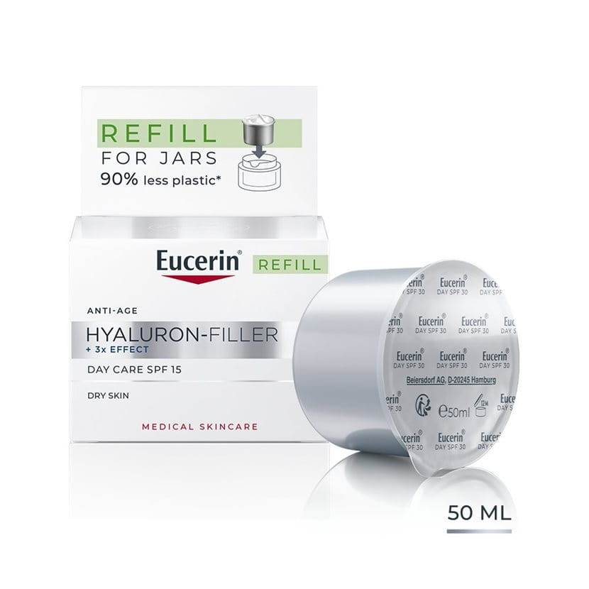 S pribúdajúcim vekom klesá prirodzená hladina kyseliny hyalurónovej v pleti, čo vedie k strate hydratácie, jemným linkám a hlbším vráskam. Eucerin Hyaluron-Filler + 3x Effect Denný krém SPF 15 pre suchú pleť je denný krém proti vráskam určený na intenzívnu hydratáciu a zároveň viditeľné vyplnenie jemných liniek a hlbších vrások. Kombinácia vysokomolekulárnej a nízkomolekulárnej kyseliny hyalurónovej účinkuje na niekoľkých úrovniach - vyhladzuje povrch pleti a zároveň preniká do hlbších vrstiev, kde pomáha obnoviť stratený objem. Vďaka SPF 15 a UVA filtrom tento krém proti vráskam pre suchú pleť tiež chráni pred predčasným starnutím pleti spôsobeným slnkom a zároveň zaisťuje dlhotrvajúcu hydratáciu a pevnejší vzhľad pleti.
