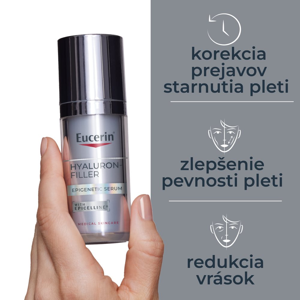 Vďaka účinnej látke epicelline® dokáže Eucerin Hyaluron-Filler Epigenetic Omladzujúce sérum zmierniť 10 príznakov starnutia pleti. Už za štyri týždne vyzerá pleť mladšie.