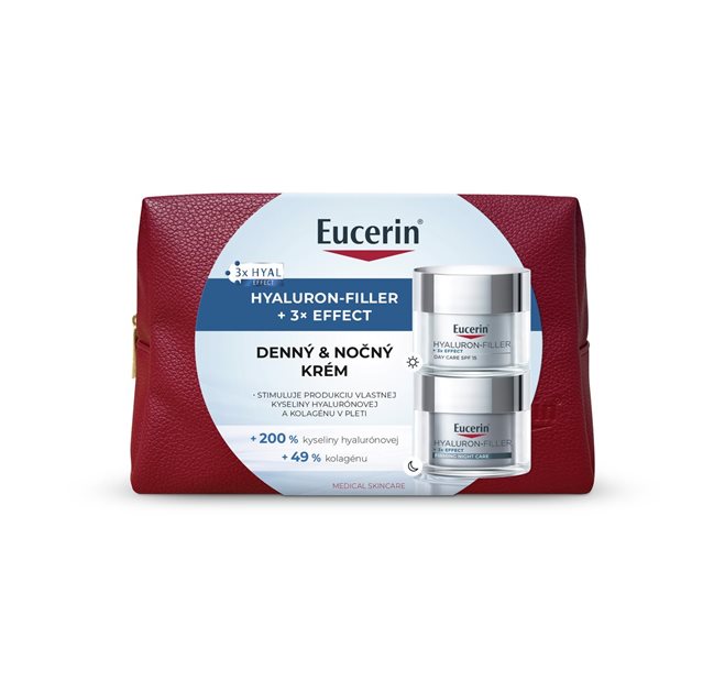 Eucerin Hyaluron-Filler + 3x Effect Denný krém pre suchú pleť bojuje s prvými známkami starnutia suchej pleti. Viditeľne vyhladzuje jemné linky aj hlboké vrásky, a stará sa tak o mladší vzhľad pleti. Poskytuje pleti účinnú ochranu proti predčasnému starnutiu spôsobenému UV žiarením a proti prehlbovaniu vrások a zároveň ju chráni pred voľnými radikálmi.
