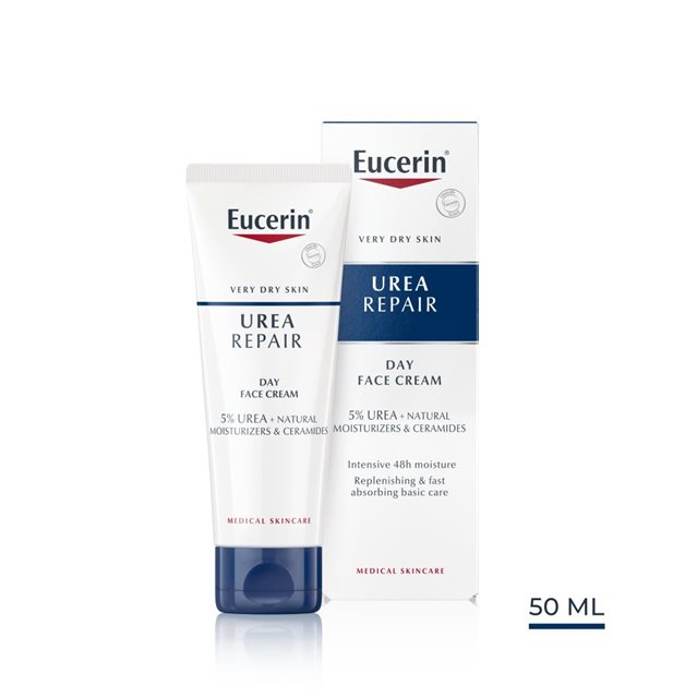 Pleť bude opäť viditeľne hladšia a pružnejšia. Eucerin UreaRepair Denný krém na tvár je rýchlo vstrebateľný prípravok na každodennú hydratáciu pre suchú až veľmi suchú pleť, ktorá je náchylná na olupovanie a pocit napätia. Krém je obohatený o ureu a mliečnan, dva prirodzené prípravky schopné viazať vlhkosť, a preto suchú pleť okamžite hydratuje. UreaRepair Denný krém na tvár tiež udržuje vlhkosť v pokožke a drsná pleť je vďaka nemu hladšia. Je ideálny ako podklad pod make-up alebo po holení. Je vhodný aj pre pokožku s psoriázou a starnúcu pleť.